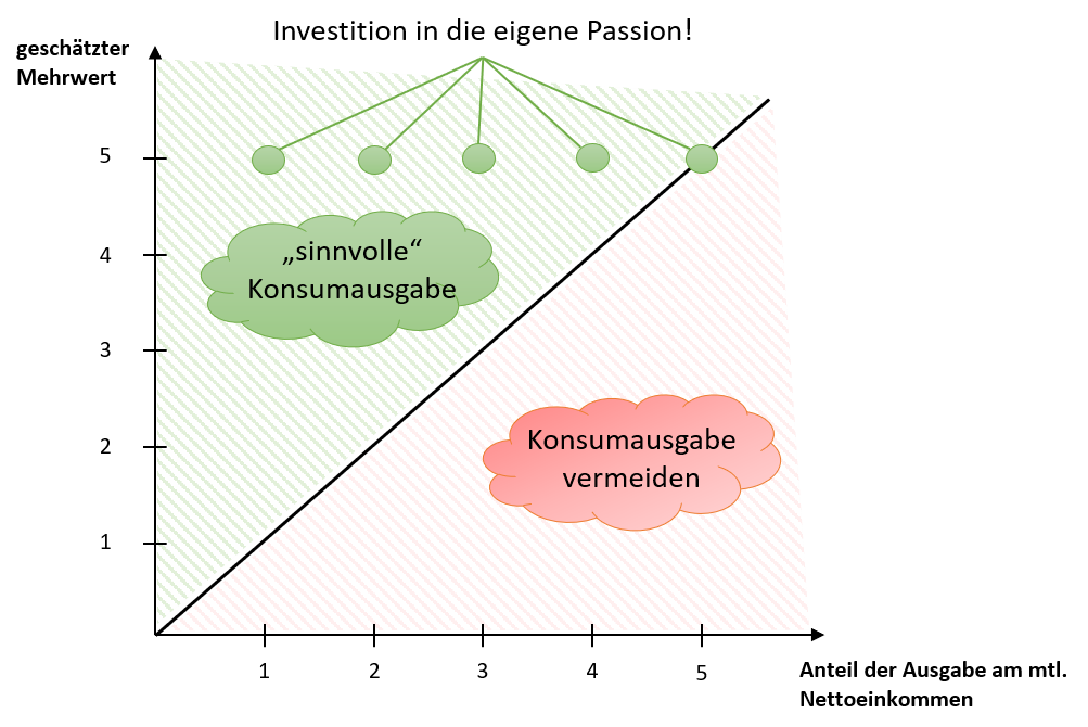 Ein Blick auf die Grafik zeigt den Zusammenhang zwischen Kosten und persönlichem Mehrwert. Alle Investitionen mit einem Mehrwert-Kosten-Verhältnis von unter 1 sollten sehr kritisch betrachtet und im besten Falls vermieden werden. Je höher das Ergebnis über der 1 liegt, desto sinnvoller scheint die Konsumausgabe zu sein.