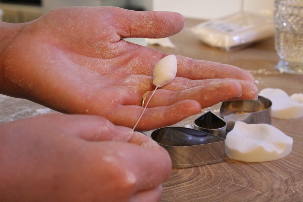 Nun widmen wir uns dem Rest der Blütenpaste. Streue zuerst etwas Speisestärke auf eine saubere Oberfläche. Rolle anschließend mit dem Nudelholz die Blütenpaste so lange aus, bis diese ca. 1 mm Dicke erreicht hat. Nun kann es ans Ausstechen gehen. Nutze zuerst den kleinsten Blütenblattausstecher und steche drei gleichgroße Blätter aus. Lege anschließend alle Blätter in den Veiner, lege die Oberseite des Veiners darauf und drücke kräftig zu. Beim Herausnehmen müsstest Du nun eine blattähnliche Struktur in der Blütenpaste erkennen können. Lege nun ein Blatt in deine Handinnenfläche und nutze das Ballwerkzeug, um die Ränder der Blüte auszudünnen und wellig zu machen. Dadurch erhalten die Zuckerrosen später einen realistischeren Look. Drücke dabei ruhig kräftig mit dem Ballwerkzeug zu und bewege es hin und her, aber bitte nicht zu doll, sonst reißt die Blütenpaste.