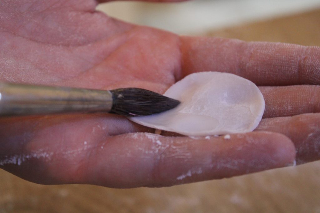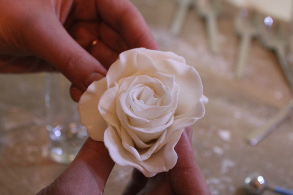 Wenn Du zufrieden mit dem Aussehen des Blütenblattes bist, befeuchte dieses an der unteren Seite leicht mithilfe des Pinsels mit Wasser und lege es anschließend um den zuvor geformten Kegel. Lege das nächste, befeuchtete Blütenblatt danach gegenüber des ersten um den Kegel. Das dritte Blütenblatt muss nun dort angelegt werden, wo die anderen beiden Blätter zusammentreffen. Nimm nun einen etwas größeren Rosenausstecher zur Hand und wiederhole die oben beschriebene Prozedur. Diese Blütenblätter müssen nun leicht versetzt jeweils nebeneinander angebracht werden. Wenn Du nun die zuvor beschriebenen Schritte mit dem größten Rosenausstecher wiederholst, lege nach der Nutzung des Ballwerkzeugs, diese in die Mulde von jeweils einem Löffel und lasse sie ca. 30 Minuten antrocknen, bevor du sie wieder versetzt an der bisherigen Rose ansetzt. Dadurch bekommen sie eine schöne, bauchigere Form und sehen noch realistischer aus. Lasse das Ganze am besten kopfüber trocknen und fertig ist Deine erste Zuckerrose!