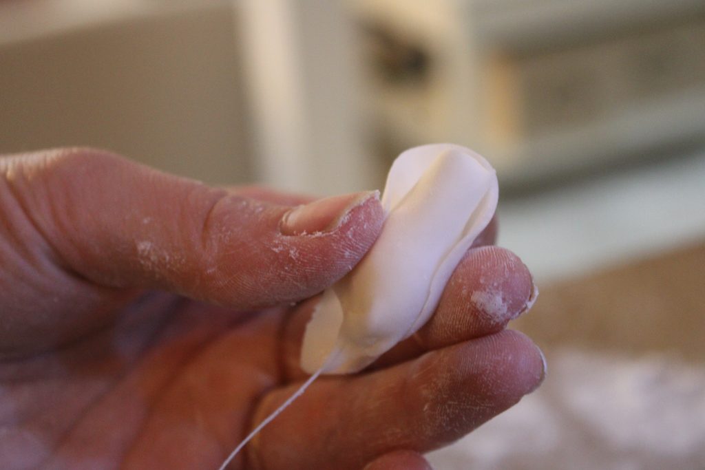 Bereite zuerst den Draht vor, indem Du ein Ende umknickst, sodass eine kleine Schlaufe entsteht. Als nächstes, knete die Blütenpaste so lange, bis diese eine kaugummiartige Konsistenz hat. Anschließend nimm eine kleine Menge der Blütenpaste ab und forme einen Ball, indem Du die Blütenpaste in kreisenden Bewegungen zwischen Deinen Handinnenflächen hin und her bewegst. Wenn der Ball fertig ist, setze diesen auf den vorgeformten Draht und stecke die Schlaufe in den Ball hinein. Danach muss der Ball durch leichtes Drücken und Drehen am oberen Ende zu einem Kegel geformt werden. Wenn Du mit dem geformten Ergebnis zufrieden bist, lege den Draht mit Kegel darauf zur Seite.