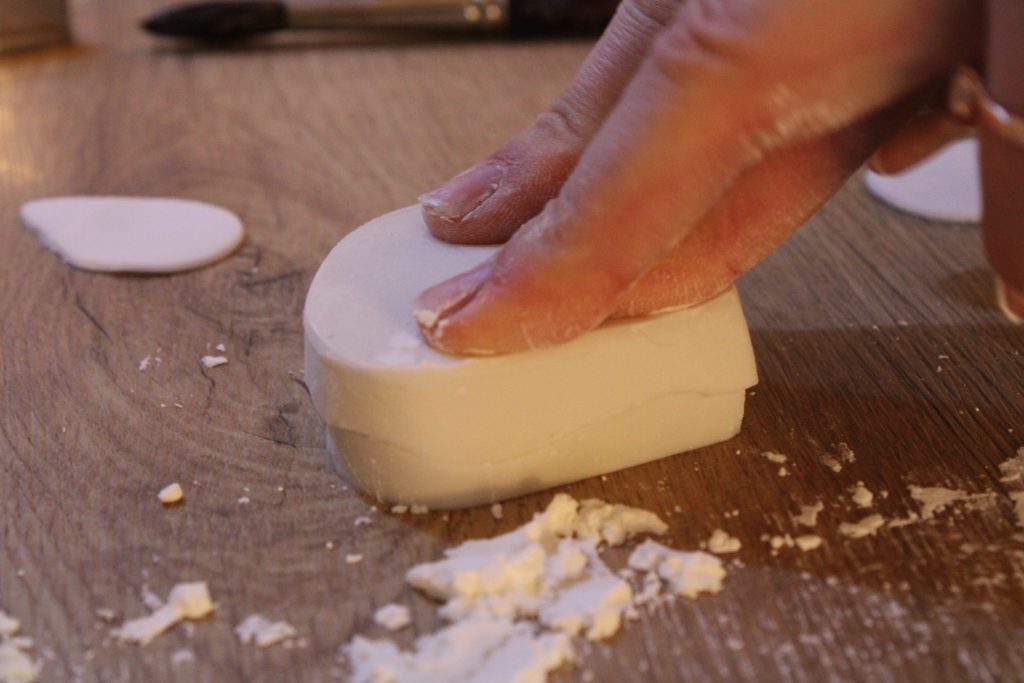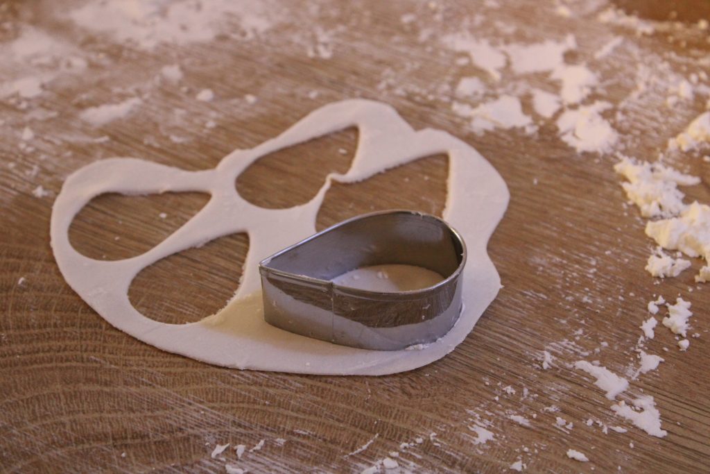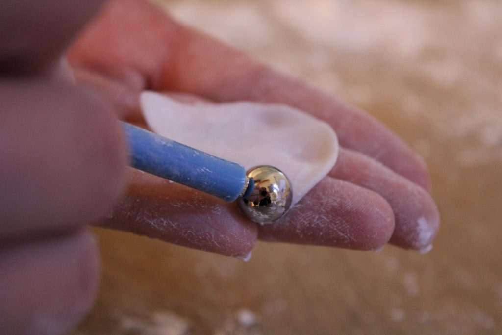 Nun widmen wir uns dem Rest der Blütenpaste. Streue zuerst etwas Speisestärke auf eine saubere Oberfläche. Rolle anschließend mit dem Nudelholz die Blütenpaste so lange aus, bis diese ca. 1 mm Dicke erreicht hat. Nun kann es ans Ausstechen gehen. Nutze zuerst den kleinsten Blütenblattausstecher und steche drei gleichgroße Blätter aus. Lege anschließend alle Blätter in den Veiner, lege die Oberseite des Veiners darauf und drücke kräftig zu. Beim Herausnehmen müsstest Du nun eine blattähnliche Struktur in der Blütenpaste erkennen können. Lege nun ein Blatt in deine Handinnenfläche und nutze das Ballwerkzeug, um die Ränder der Blüte auszudünnen und wellig zu machen. Dadurch erhalten die Zuckerrosen später einen realistischeren Look. Drücke dabei ruhig kräftig mit dem Ballwerkzeug zu und bewege es hin und her, aber bitte nicht zu doll, sonst reißt die Blütenpaste.